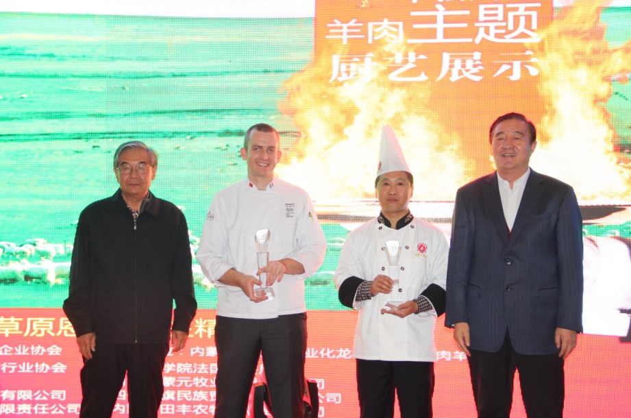 本次廚藝比拼展示主要是中法兩國廚師之間的高手對決。兩國大廚根據(jù)羊肉的不同部位烹飪出各道菜品。本次比拼的標準主要是養(yǎng)生、創(chuàng)意和具有地域特色。各評委經(jīng)過仔細品嘗后評選出特等獎、一等獎各一名。最終由遠道而來的法國大廚獲得特等獎,我們中國廚師隊獲得一等獎。原副主任雷·額爾德尼和原副主席傅守正為獲獎選手頒發(fā)獎杯。