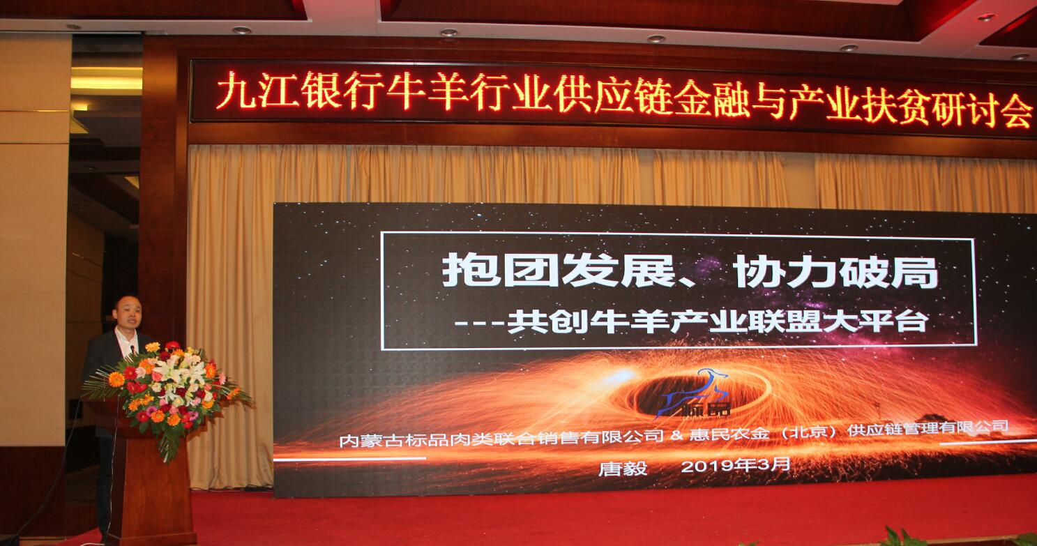 2019年3月15日,由九江銀行股份有限公司、內(nèi)蒙古農(nóng)牧業(yè)產(chǎn)業(yè)化龍頭企業(yè)協(xié)會(huì)內(nèi)蒙古標(biāo)品肉類聯(lián)合銷售有限公司聯(lián)合主辦,主題為“產(chǎn)業(yè)聯(lián)盟謀發(fā)展,科技金融惠三農(nóng)”——牛羊行業(yè)供應(yīng)鏈金融與產(chǎn)業(yè)扶貧研討會(huì)在江西省九江市廬山西海隆重召開(kāi)。