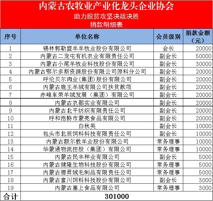 內(nèi)蒙古農(nóng)牧業(yè)產(chǎn)業(yè)化龍頭企業(yè)協(xié)會,作為自治區(qū)各級產(chǎn)業(yè)化重點龍頭企業(yè)的聯(lián)合體,始終堅持以習(xí)近平總書記“三農(nóng)”思想為根本遵循,圍繞協(xié)會“溝通、服務(wù)、自律、發(fā)展”的工作宗旨,發(fā)揮協(xié)會的橋梁和紐帶作用,堅持為企業(yè)服務(wù)、為行業(yè)服務(wù)、為政府服務(wù)、為農(nóng)牧民服務(wù)。協(xié)會在自治區(qū)農(nóng)牧廳的指導(dǎo)下,將繼續(xù)堅持投身助力內(nèi)蒙古脫貧攻堅工作中,貢獻(xiàn)自己的力量。