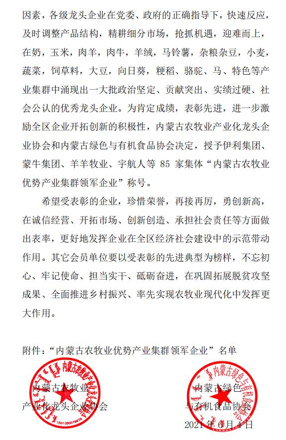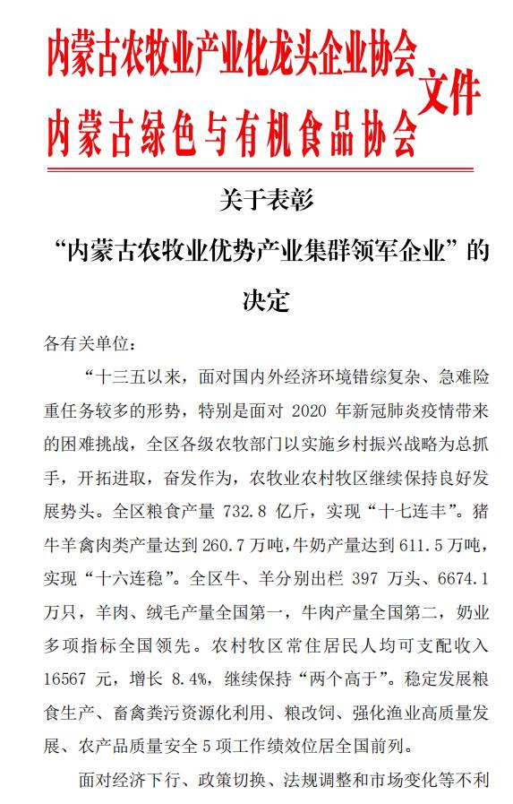 標(biāo)題:關(guān)于表彰“內(nèi)蒙古農(nóng)牧業(yè)優(yōu)勢產(chǎn)業(yè)集群領(lǐng)軍企業(yè)”的決定
