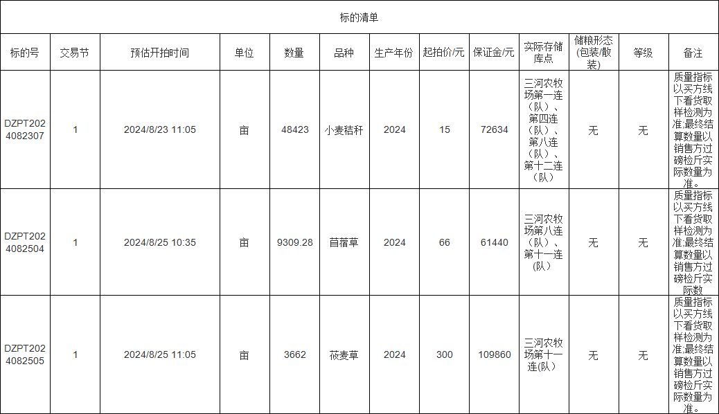 轉讓標的為苜蓿草、莜麥草、小麥秸稈,涉及面積苜蓿草9309.28畝、莜麥草3662畝、小麥秸稈48423畝,意向受讓方在競標前應自行對標的預估數量和質量情況進行充分了解,交易標的均以實際狀況為準。標的存放地位于三河農牧場,詳情見標的清單: