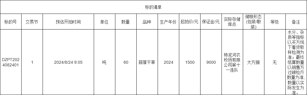 轉(zhuǎn)讓標(biāo)的為苜蓿干草60噸,標(biāo)的存放地位于特泥河農(nóng)牧場(chǎng)有限公司第十一連隊(duì),詳情見(jiàn)標(biāo)的清單: