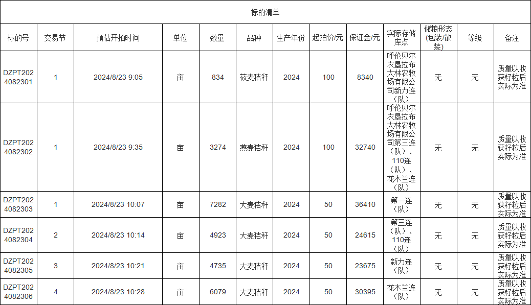 轉(zhuǎn)讓標(biāo)的為莜麥秸稈、燕麥秸稈、大麥秸稈,涉及面積莜麥秸稈834畝、燕麥秸稈3274畝、大麥秸稈(1-4標(biāo))分別為7282畝、4923畝、4735畝、6079畝,意向受讓方在競買前應(yīng)自行對標(biāo)的預(yù)估數(shù)量和質(zhì)量情況進(jìn)行充分了解,交易標(biāo)的均以實(shí)際狀況為準(zhǔn)。標(biāo)的存放地位于呼倫貝爾農(nóng)墾拉布大林農(nóng)牧場有限公司,詳情見標(biāo)的清單:
