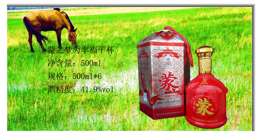 蒙酒酒業(yè)公司簡(jiǎn)介 一、 企業(yè)文化:誠(chéng)邀天下友,共圓蒙酒夢(mèng) 二、 公司簡(jiǎn)介: 蒙酒酒業(yè)有限責(zé)任公司位于中國(guó)北方著名的紅山文化圣地、中華第一龍的故鄉(xiāng)——內(nèi)蒙古赤峰市。 蒙酒酒業(yè)建在蒙古時(shí)期的“神井燒鍋”原址上,選用東北優(yōu)質(zhì)高粱、神井地下水,采用傳統(tǒng)工藝和配方,結(jié)合現(xiàn)代生物技術(shù),開(kāi)發(fā)出了優(yōu)質(zhì)的原生態(tài)蒙酒,具有清澈透明...