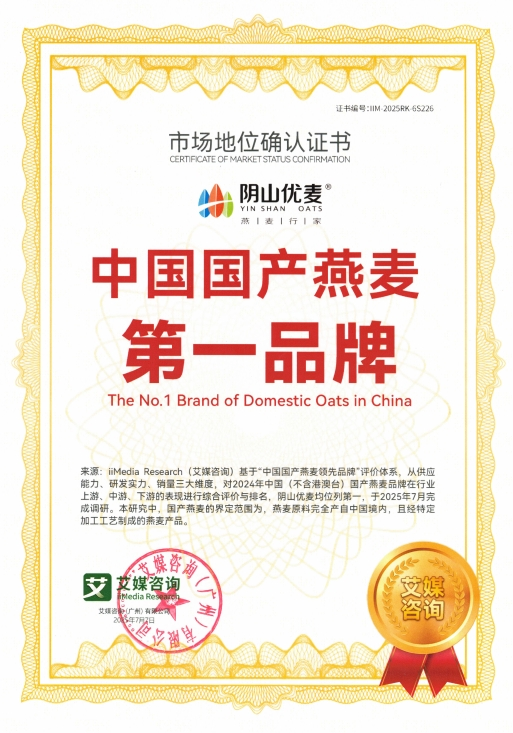 艾媒咨詢本次頒發(fā)的市場(chǎng)地位確認(rèn)證書,基于詳實(shí)的全球及中國(guó)市場(chǎng)調(diào)研數(shù)據(jù)、市場(chǎng)份額、產(chǎn)品影響力等多維度嚴(yán)格評(píng)估。陰山優(yōu)麥能夠同時(shí)斬獲“全球裸燕麥第一品牌”與“中國(guó)國(guó)產(chǎn)燕麥第一品牌”雙項(xiàng)殊榮,有力印證了其全球裸燕麥行業(yè)的標(biāo)桿地位,代表中國(guó)企業(yè)在世界裸燕麥舞臺(tái)占據(jù)制高點(diǎn),產(chǎn)品品質(zhì)與品牌影響力獲得國(guó)際市場(chǎng)高度認(rèn)可。